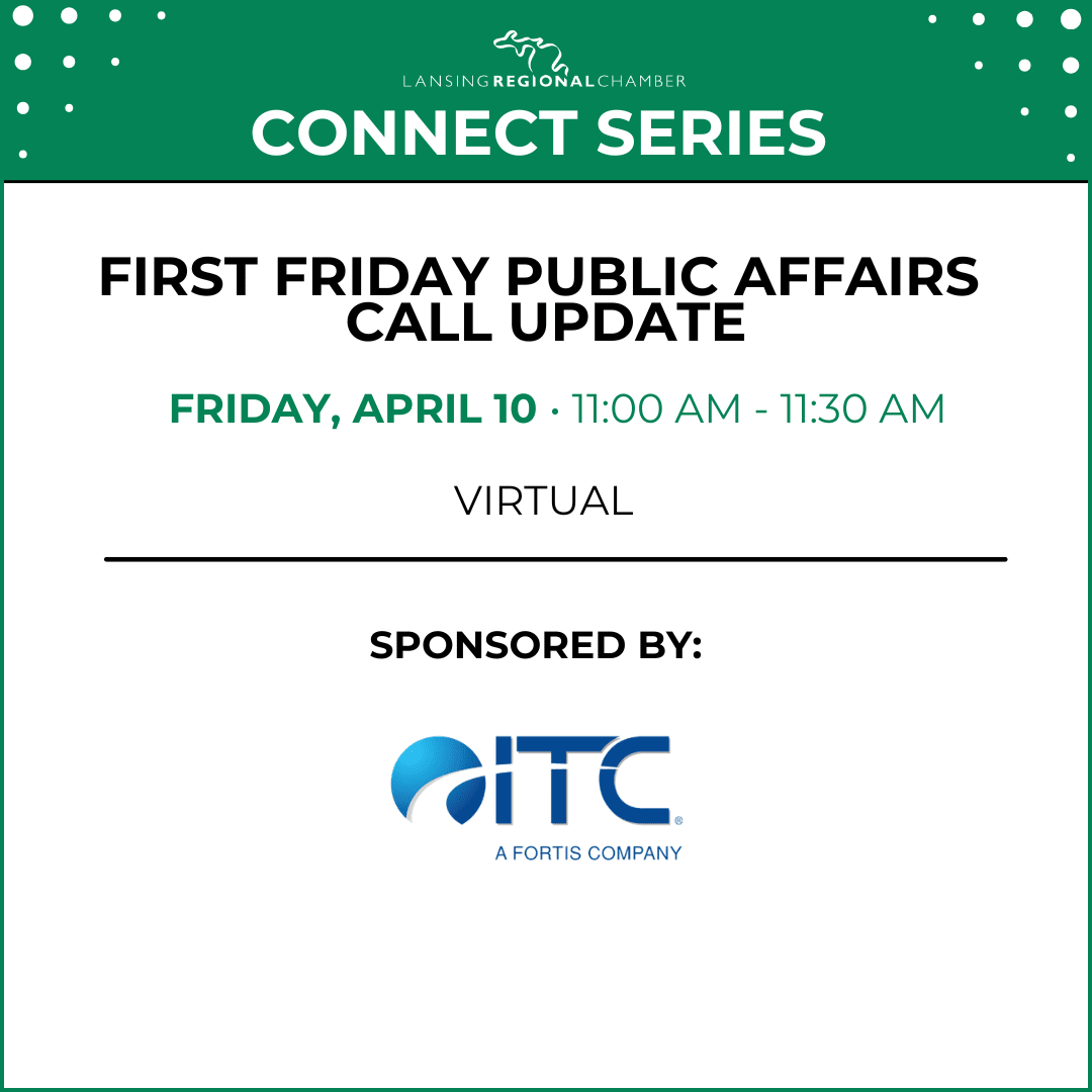 •Monthly 30-Minute Calls: These concise and informative sessions are designed to fit seamlessly into your schedule, ensuring you stay informed without taking up too much of your time.•ZOOM Video Conference: Join us on the ZOOM platform for an interactive experience that brings the community together virtually.•Complimentary for LRCC Members: As a benefit of LRCC membership, these calls come at no additional charge.It's our way of ensuring you have the information you need to navigate today's dynamic business environment. For more information, please contact LRCC public affairs vice president Steve Japinga at 517-853-6467 or sjapinga@lansingchamber.org
