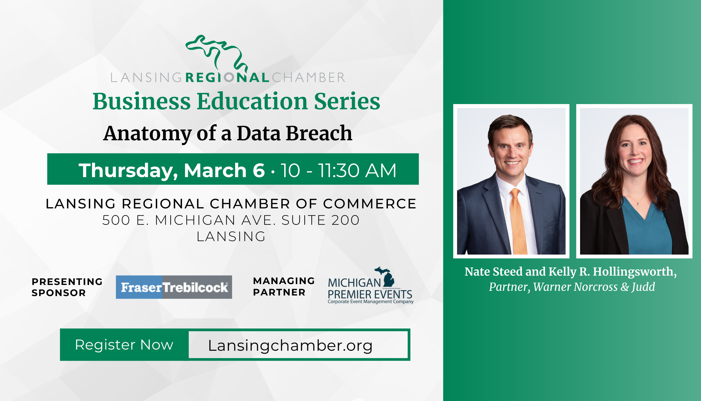 During the March Business Education Series facilitated by Nate Steed, partner, Warner Norcross + Judd, and Kelly R. Hollingsworth, partner, Warner Norcross + Judd, this session will examine recent cases and best practices to protect your company from a breach including: lessons learned from recent data breaches; proactive strategies to insulate your business.