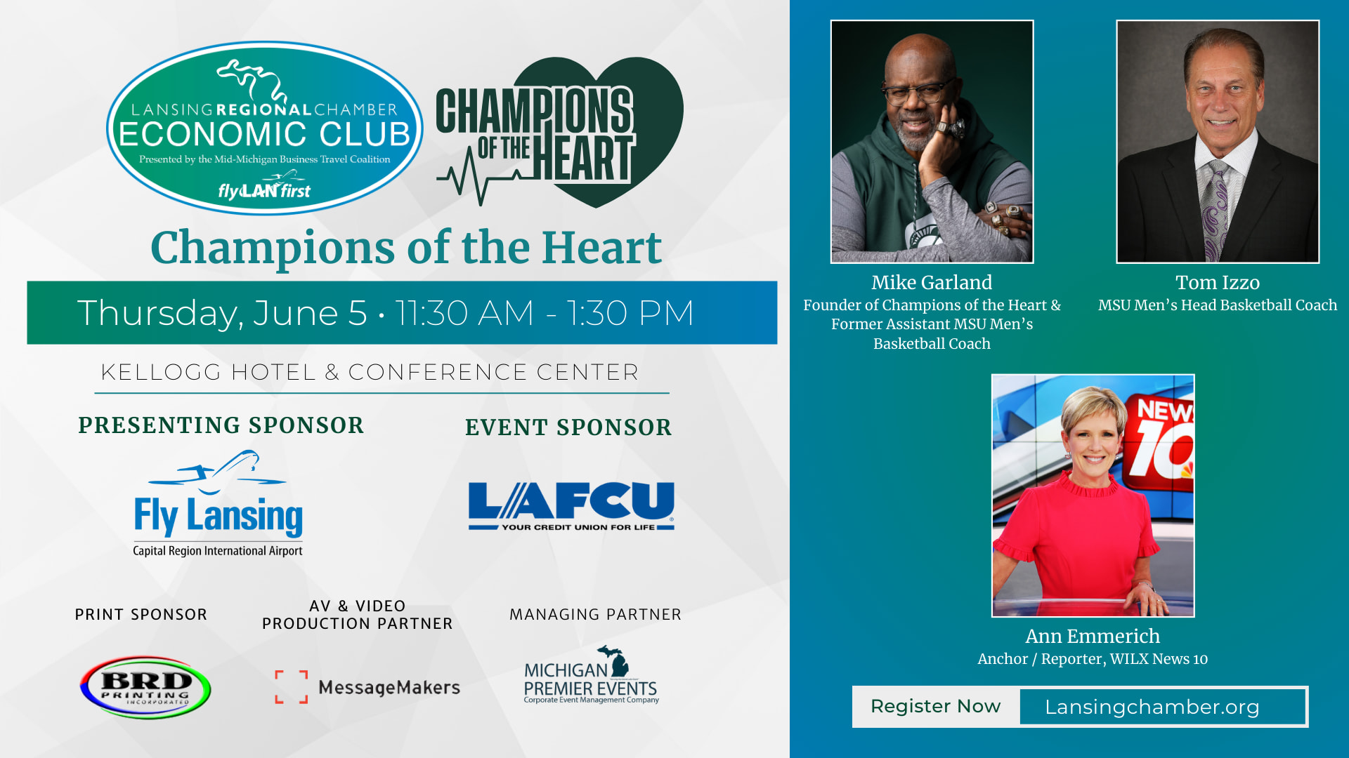 Join us at the Lansing Economic Club on Thursday, June 5th, for an inspiring fireside chat with Michael Garland, former assistant Michigan State University basketball coach and founder of Champions of the Heart. Michael will be joined by special guest, Hall of Fame MSU Men's Basketball Coach Tom Izzo.