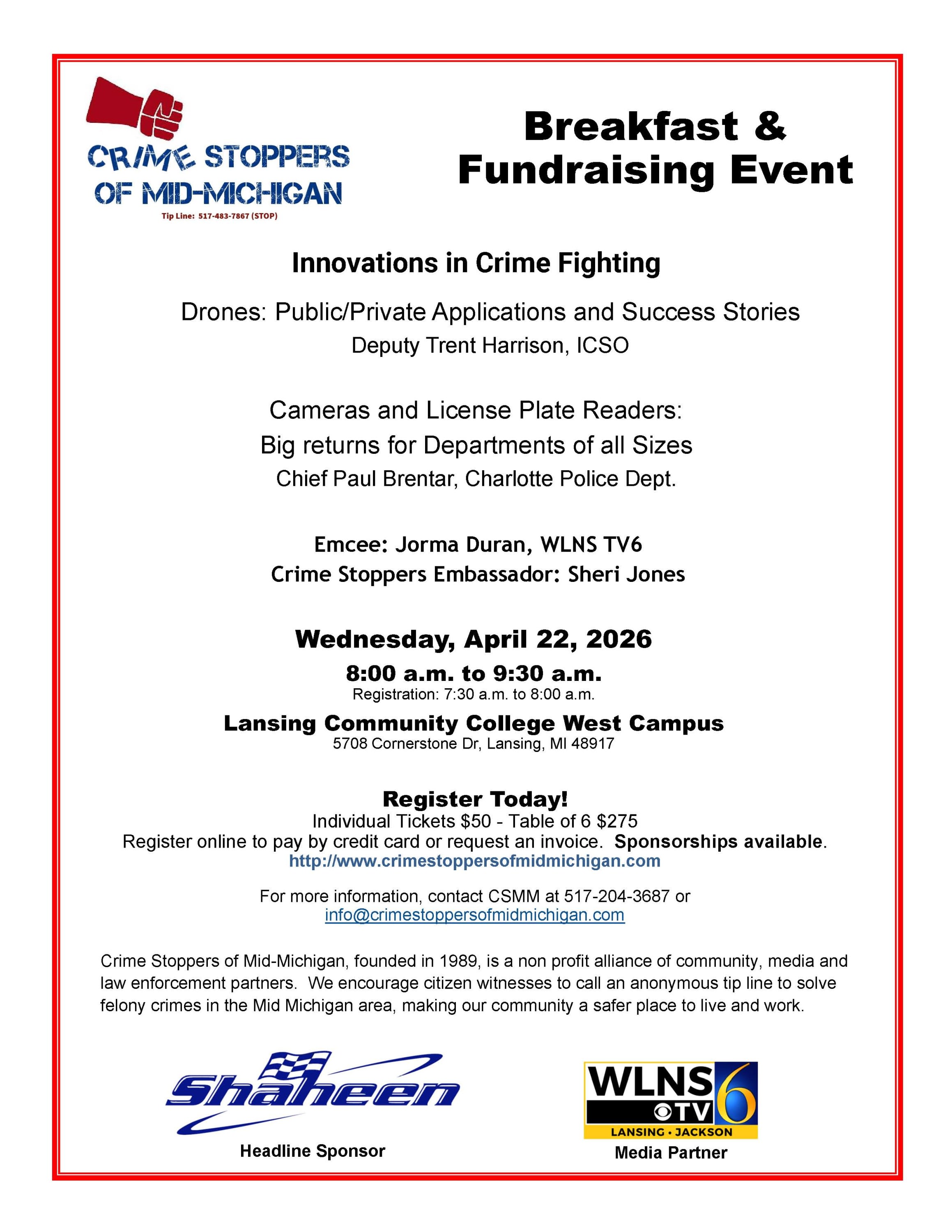 Register online to pay by credit card or request an invoice. Sponsorships available. http://www.crimestoppersofmidmichigan.com
