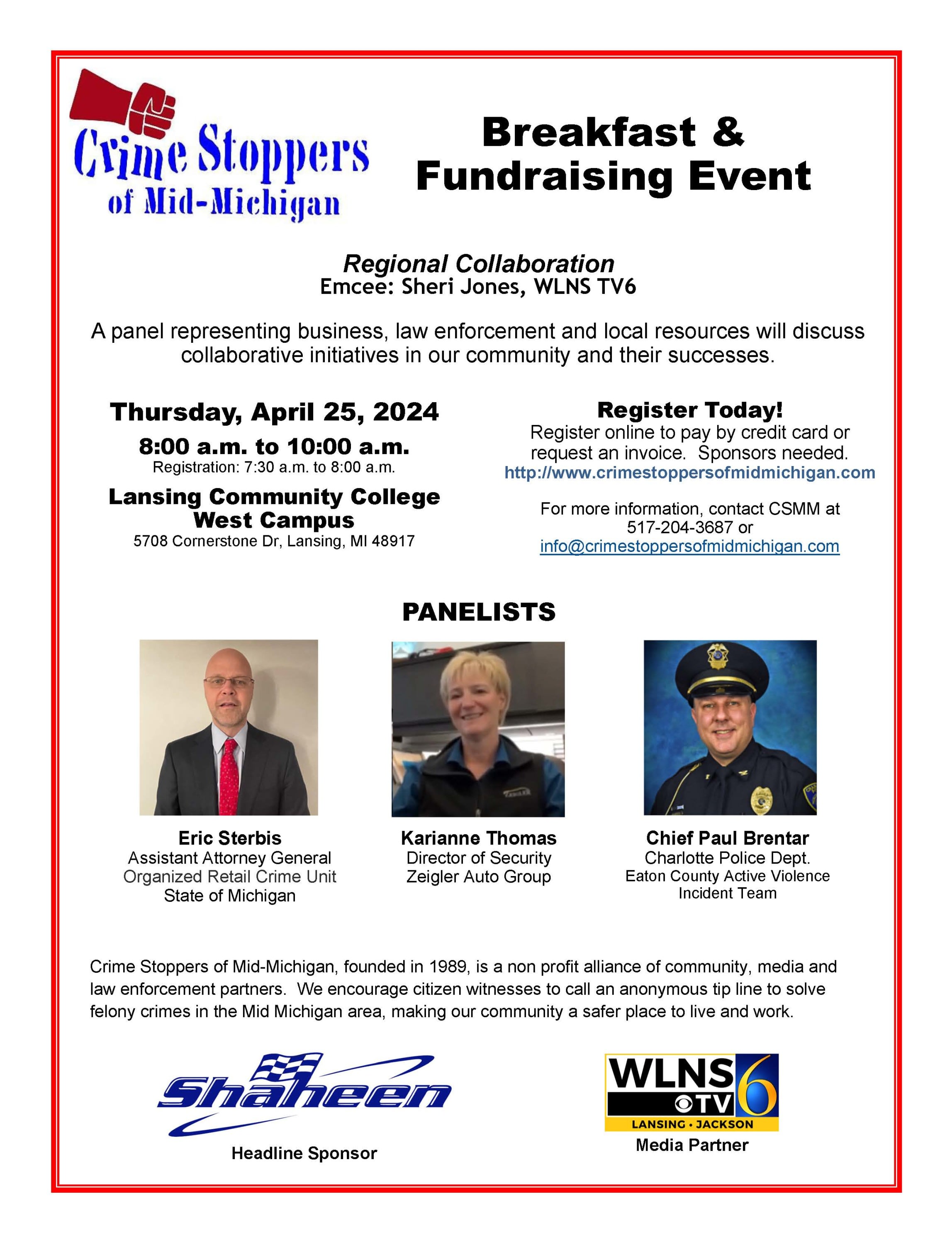 Join us for our Annual Breakfast and Fundraising event. Our theme this year is Regional Collaboration. Emcee: Sheri Jones, WLNS TV6, will moderate a panel of partners representing business, law enforcement and local resources to discuss collaborative initiatives in our community and their successes. Panelists: Eric Sterbis, Assistant Attorney General, Organized Retail Crime Unit, State of Michigan; Karianne Thomas, Director of Security, Zeigler Auto Group; Chief Paul Brentar, Charlotte Police Dept. and Eaton County Active Violence Incident Team.