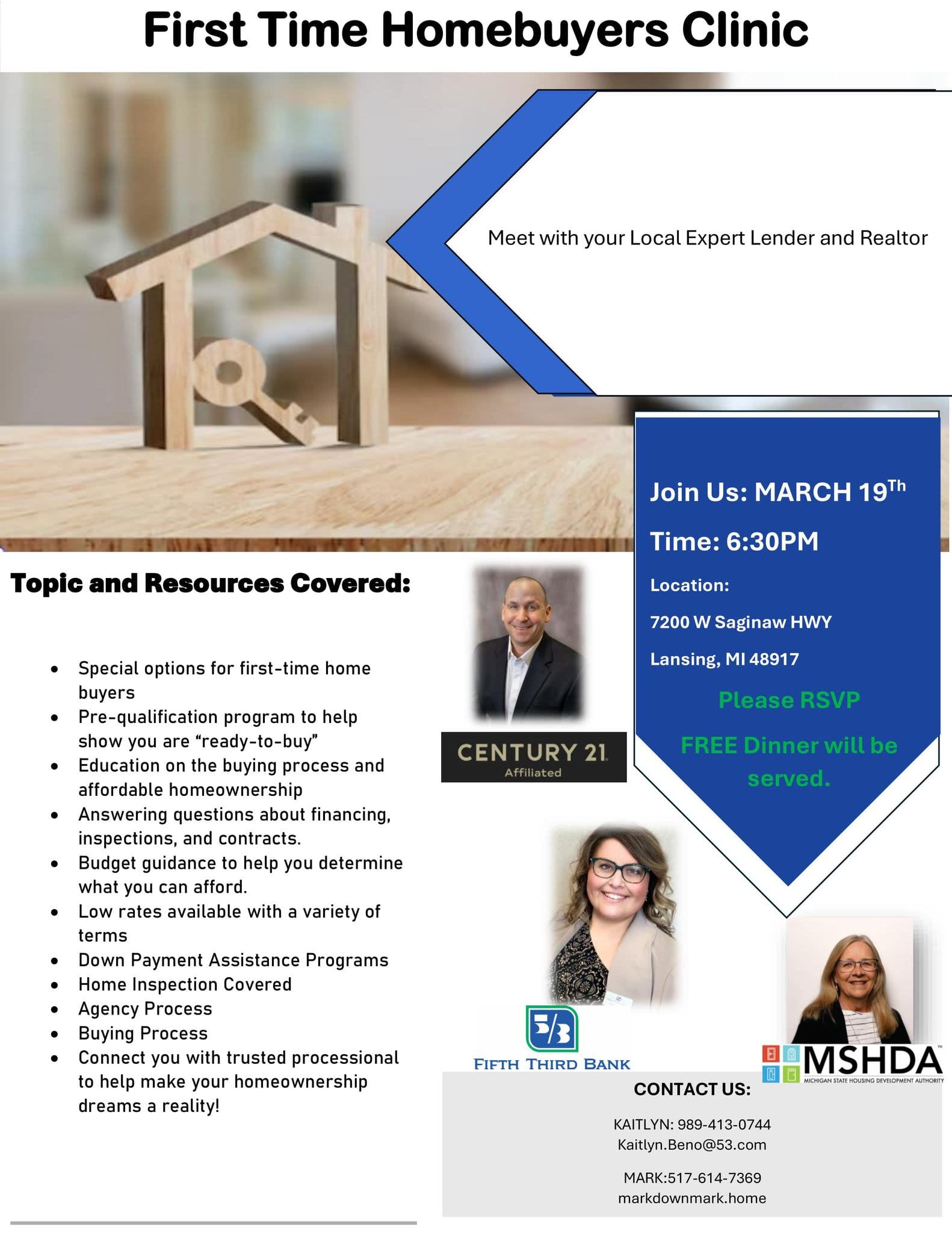 Learn about financing options, MSHDA programs, and the homebuying process. Don’t miss this chance to get your questions answered! Please RSVP to Mark at 517.614.7369 or Kaitlyn at 989-413-0744 to save your seat.