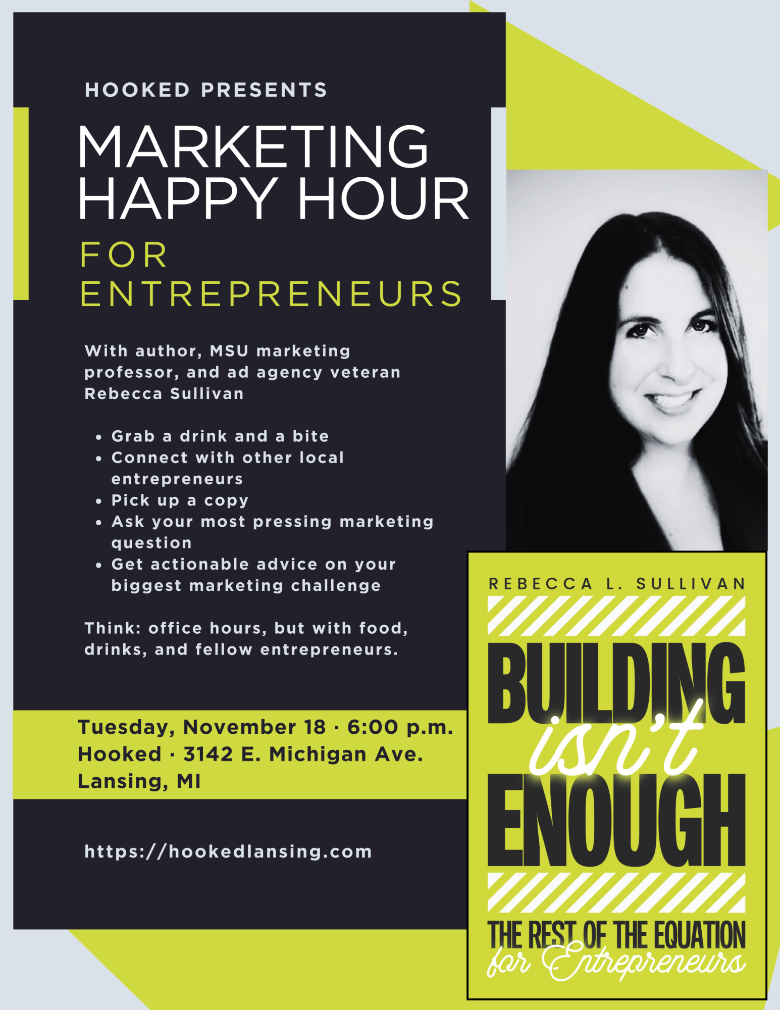 Think: Office Hours, but with food, drinks and fellow entrepreneurs. With Author, MSU Marketing Professor, and ad agency veteran Rebecca Sullivan.