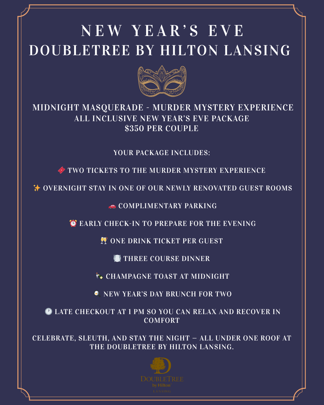 Join us this New Year’s Eve for an unforgettable evening filled with intrigue, elegance, and excitement as you enjoy a live interactive murder mystery dinner, champagne toast, and celebration to welcome 2026.