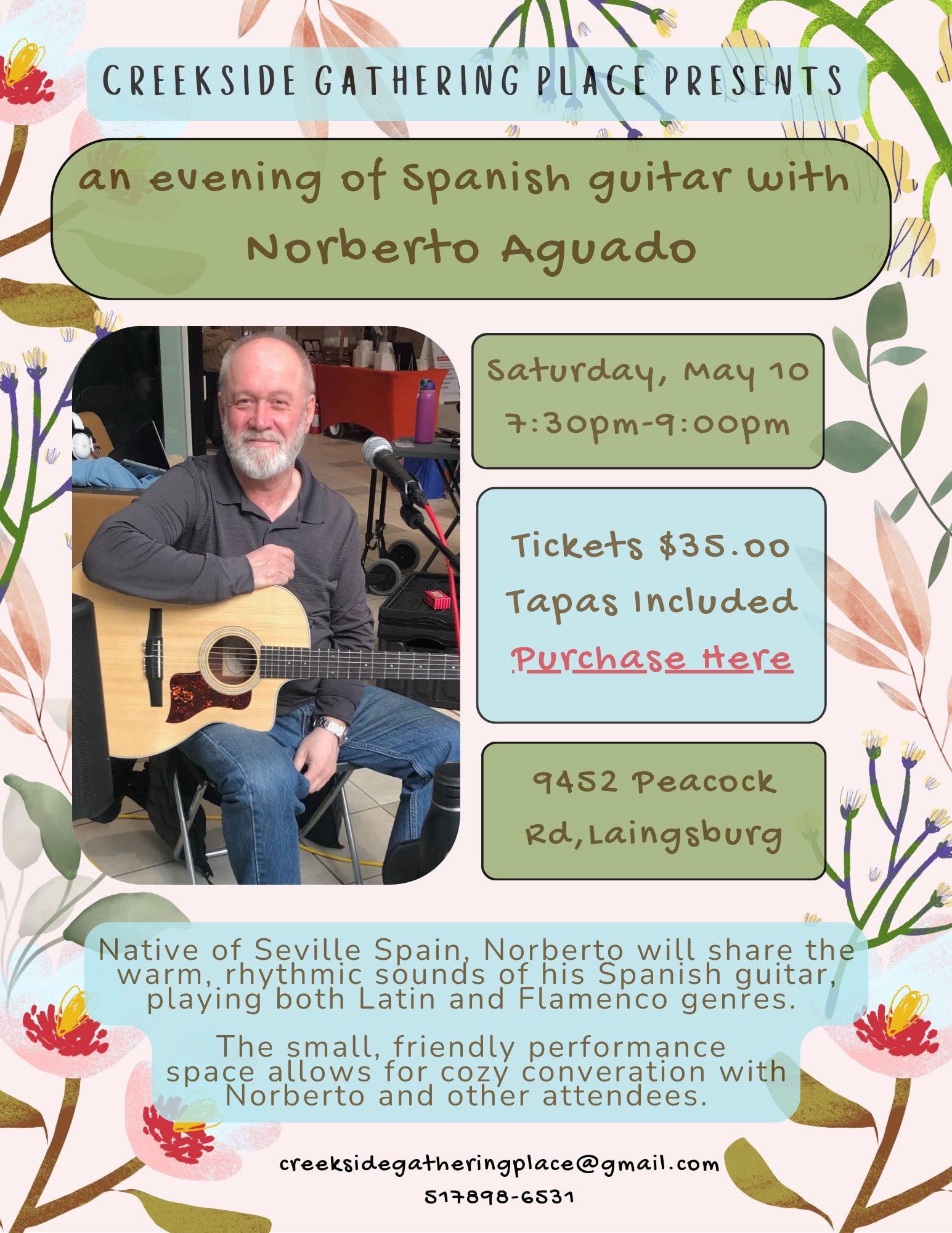The small, friendly, intimate space at Creekside Gathering Place creates a distinctive setting for a concert. We invite you to interact with Norberto through questions and conversation to learn more about his art and craft. Come gather together and enjoy an evening of music and merriment. The evening includes refreshments.