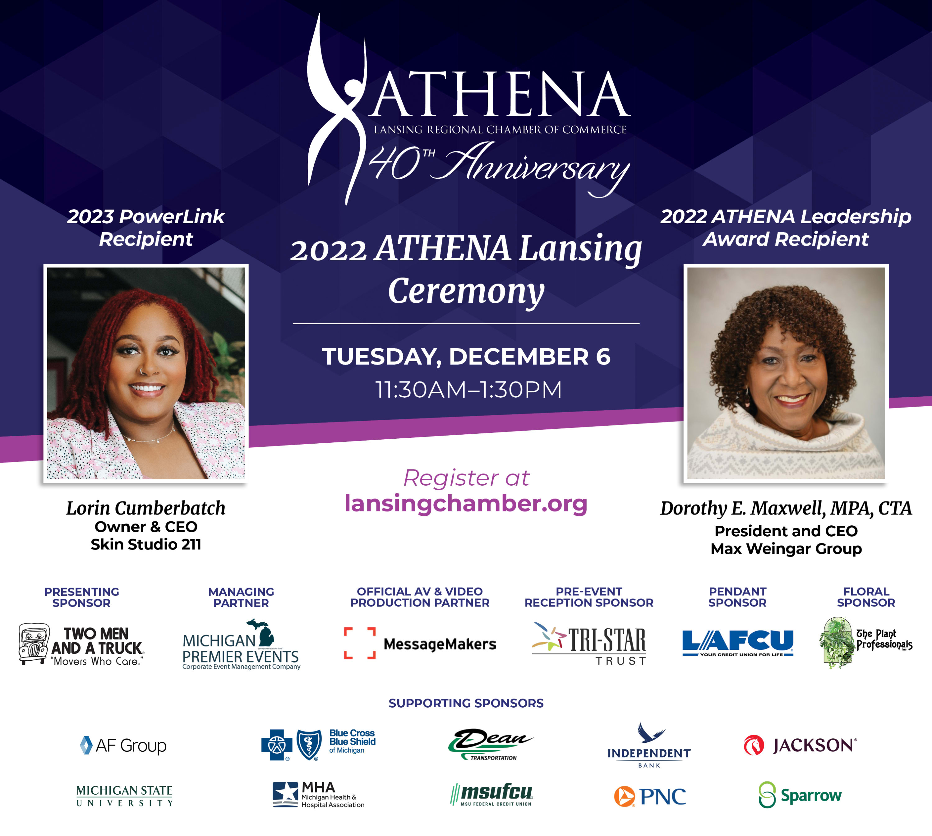 Join the Lansing Regional Chamber on Tuesday, Dec. 6 to celebrate ATHENA Lansing! Celebrating its 40th anniversary in 2022, the ATHENA Leadership Awards is presented annually in over 500 communities international. It recognizes individuals for professional excellence, providing valuable service to the community and actively assisting women in attaining professional excellence and leadership skills. Dorothy E. Maxwell, president and CEO of the Max Weingar, has been named the 2022 ATHENA Leadership Award recipient. In addition, Lorin Cumberbatch, owner and CEO of Skin Studio 211, has been selected as the 2023 ATHENA PowerLink (APL) recipient by the Lansing Regional Chamber of Commerce. Thank you to our presenting sponsor, Two Men and A Truck.