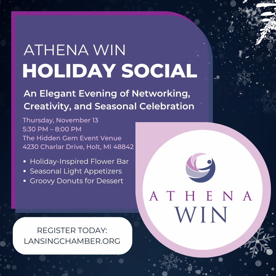 Join us for the ATHENA WIN Holiday Social on Thursday, November 13th, from 5:30 to 8:00 p.m. at The Hidden Gem!
