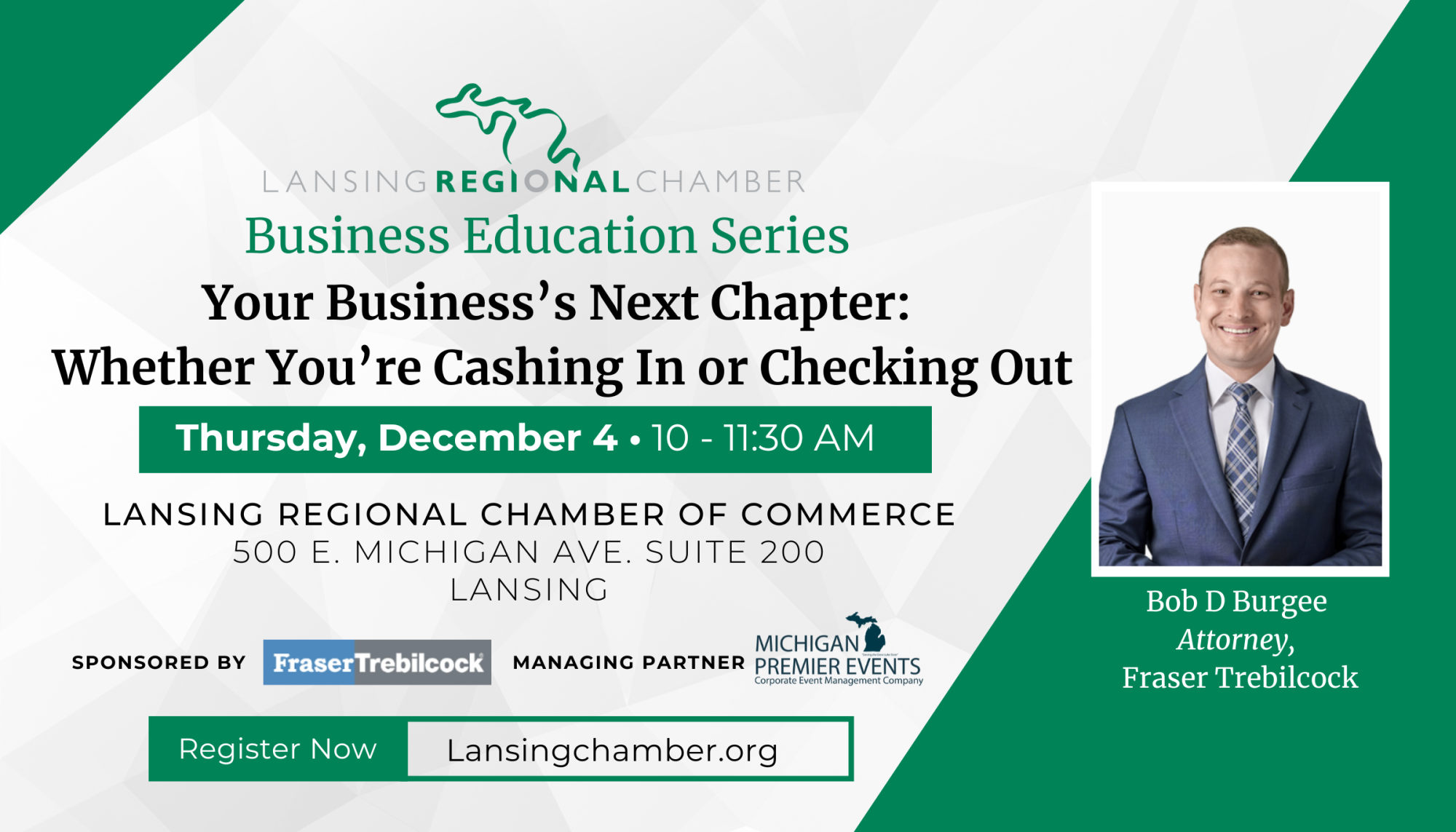 Planning for the future of your business is one of the most important steps an owner can take—whether you’re just starting to think about succession or preparing to transition out. Join Fraser Trebilcock Attorney Bob D. Burgee for the next Business Education Series event, where he will guide business owners through the essential considerations for a smooth and successful exit. From early-stage planning to strategies you can implement years ahead, this session is designed to give practical insights and actionable steps for businesses of any size or stage. Open to all business owners and those interested in learning what it takes to protect the legacy of their business.