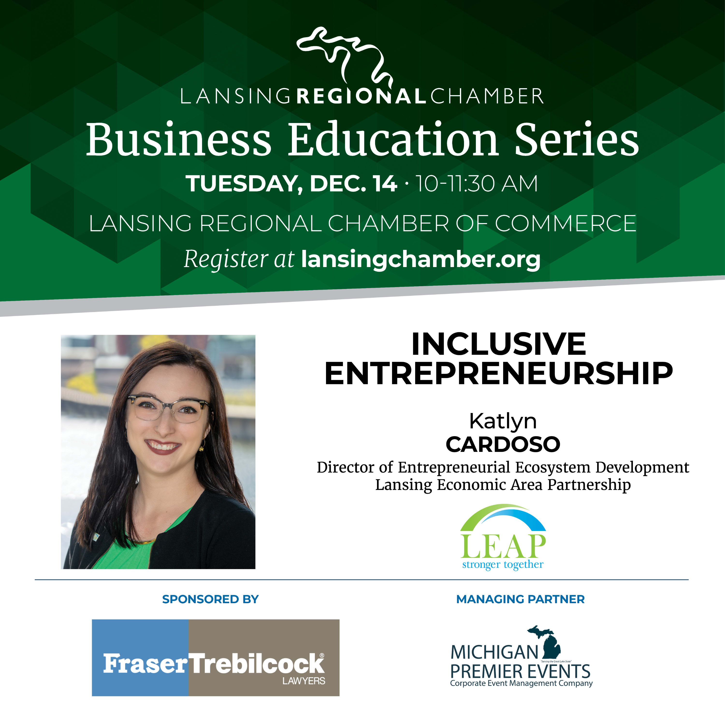 Katlyn Cardoso, director of entrepreneurial ecosystem development at the Lansing Economic Area Partnership (LEAP) will discuss several inclusive entrepreneurship topics, including LEAP's One and All-Inclusive Entrepreneurship Program and its impact on the Greater Lansing community, and the value of entrepreneurial support and equity/inclusion in creating robust, thriving local economies.