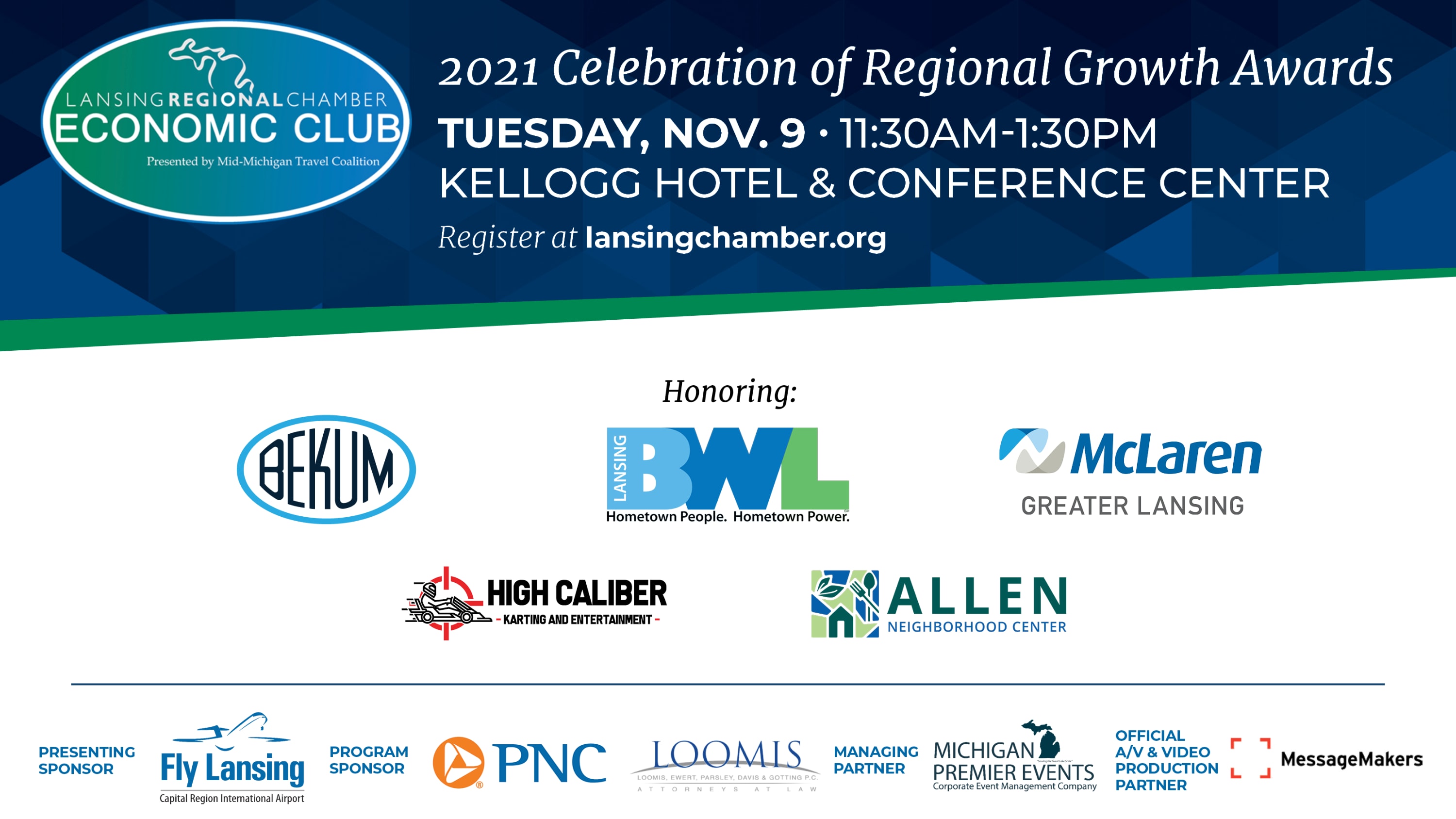 The Celebration of Regional Growth (CORG) Awards luncheon is part of Lansing Regional Chamber of Commerce’s monthly Lansing Economic Club. The CORG Awards recognize businesses for their new economic investment and job creation in the Greater Lansing region. This year, the Lansing Regional Chamber of Commerce will recognize: Bekum North America, Lansing Board of Water and Light, McLaren Greater Lansing, High Caliber Karting & Entertainment and Allen Neighborhood Center. Join us at the Kellogg Hotel and Conference Center on Tuesday, Nov. 9 from 11:30 a.m. to 1:30 p.m.