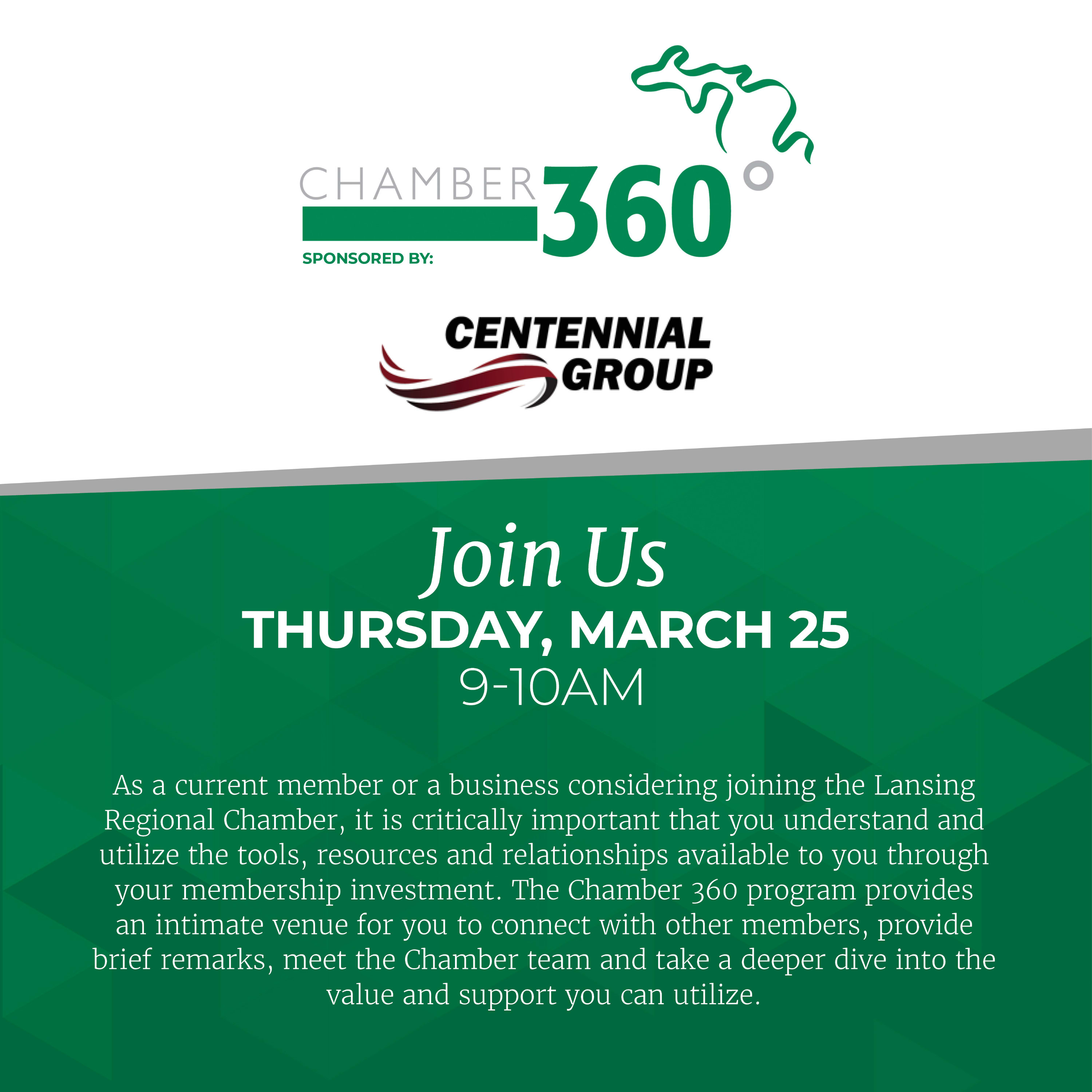 As a current member or a business considering joining the Lansing Regional Chamber of Commerce (LRCC), it is critically important that you understand and utilize the tools, resources and relationships available to you through your membership investment. The Chamber 360 program provides an intimate venue for you to connect with other members, provide brief remarks, meet the LRCC team and take a deeper dive into the value and support you can utilize. The goal of the program is to acclimate you with your investment and put together a plan of action for membership engagement and strong ROI.