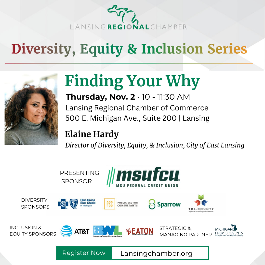 The November Diversity, Equity and Inclusion Series will be led by Elaine Hardy, director of diversity, equity and inclusion for the City of East Lansing, and will explore why senior leadership, CEOs and executives need to have a clearly defined personal commitment to DEI, and why if they do not, it would be impossible to embed equity in their organizations.