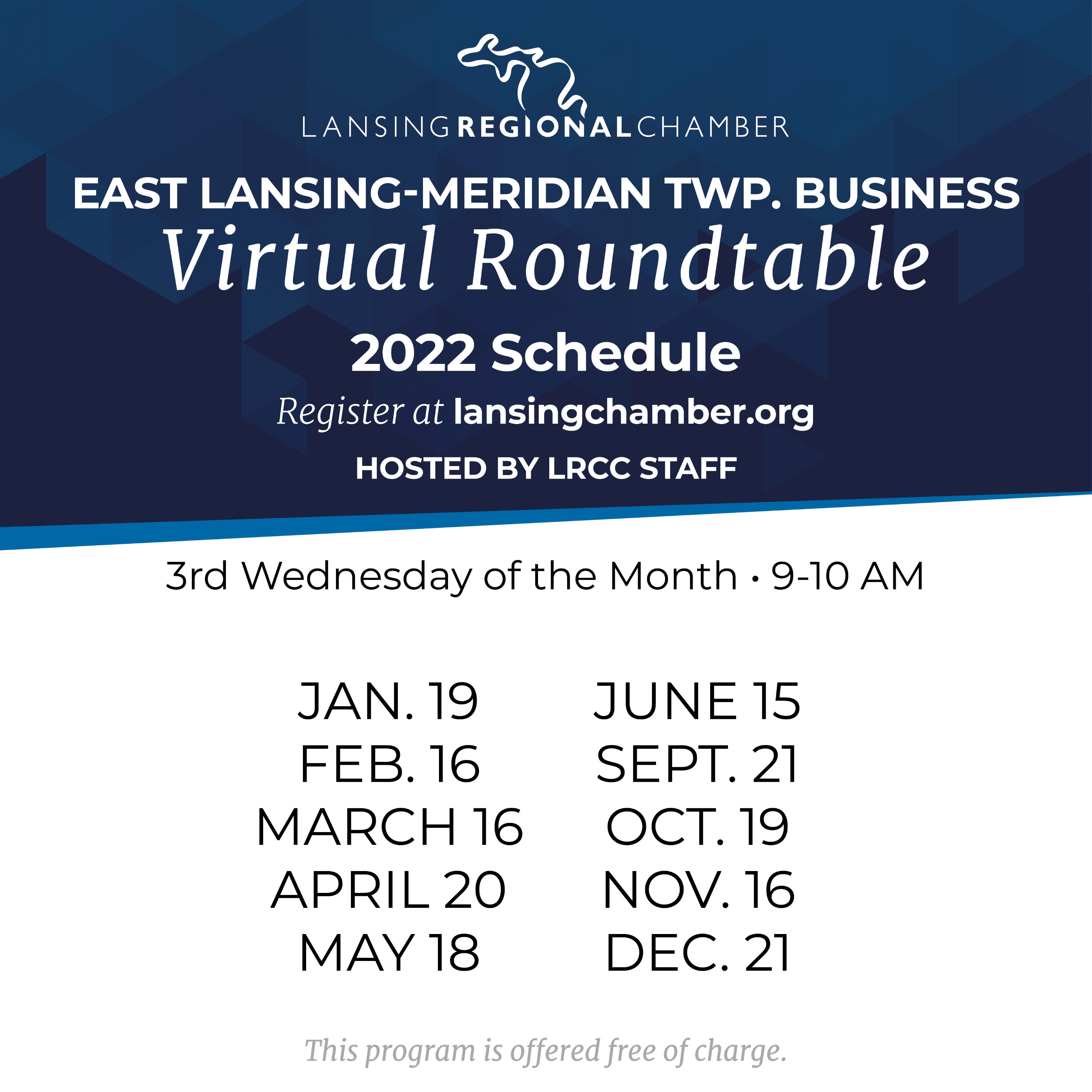The Lansing Regional Chamber of Commerce (LRCC) East Lansing-Meridian Township Roundtable meets on the third Wednesday of the month from 9 to 10 a.m. It consists of LRCC business members and public officials from every level of government (city, county, state and federal), including school districts. A variety of issues relevant to the business community and region are discussed during the roundtables. It's been the main focus of the LRCC to continue to build healthy relationships between businesses and elected officials.