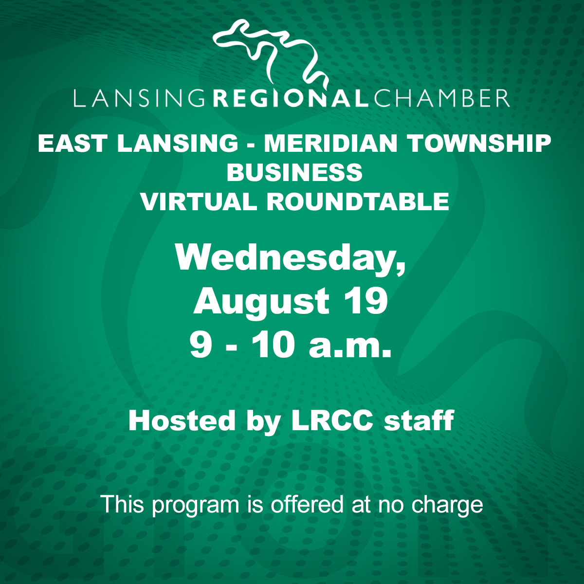 The Lansing Regional Chamber of Commerce (LRCC) East Lansing-Meridian Township Roundtable meets once a month. It consists of LRCC business members as well as public officials from every level of government (city, county, state and federal), including school districts. A variety of issues relevant to the business community and region are discussed during the roundtables. It's been the main focus of the LRCC to continue to build healthy relationships between business and elected officials. Questions can be directed to Steve Japinga, vice president of public affairs, LRCC, at sjapinga@lansingchamber.org.