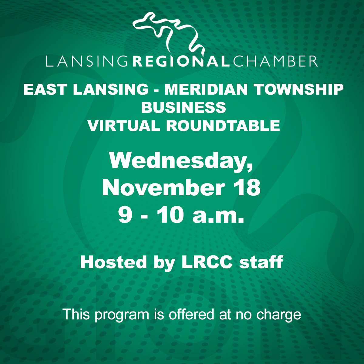 The Lansing Regional Chamber of Commerce (LRCC) East Lansing-Meridian Township Roundtable meets once a month. It consists of LRCC business members as well as public officials from every level of government (city, county, state and federal), including school districts. A variety of issues relevant to the business community and region are discussed during the roundtables. It's been the main focus of the LRCC to continue to build healthy relationships between business and elected officials. Questions can be directed to Steve Japinga, vice president of public affairs, LRCC, at sjapinga@lansingchamber.org.