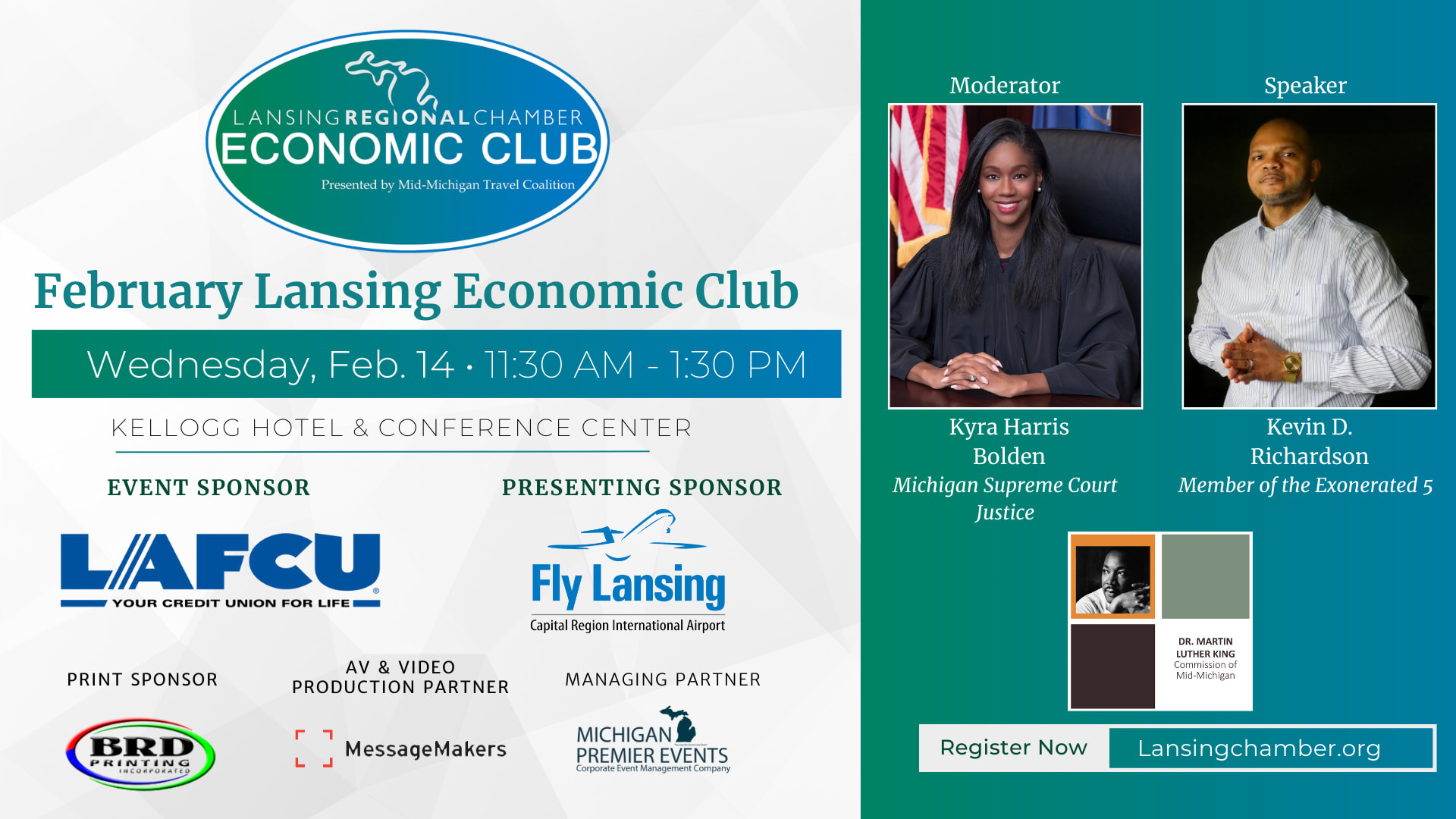 In partnership with the Dr. Martin Luther King Jr. Commission of Mid-Michigan, the Lansing Economic Club will welcome Kevin D. Richardson, Member of the Exonerated 5, on Wednesday, Feb. 14. Richardson will share his story about the injustices he and the Central Park Five experienced. The program will be moderated by Michigan Supreme Court Justice Kyra Harris Bolden.