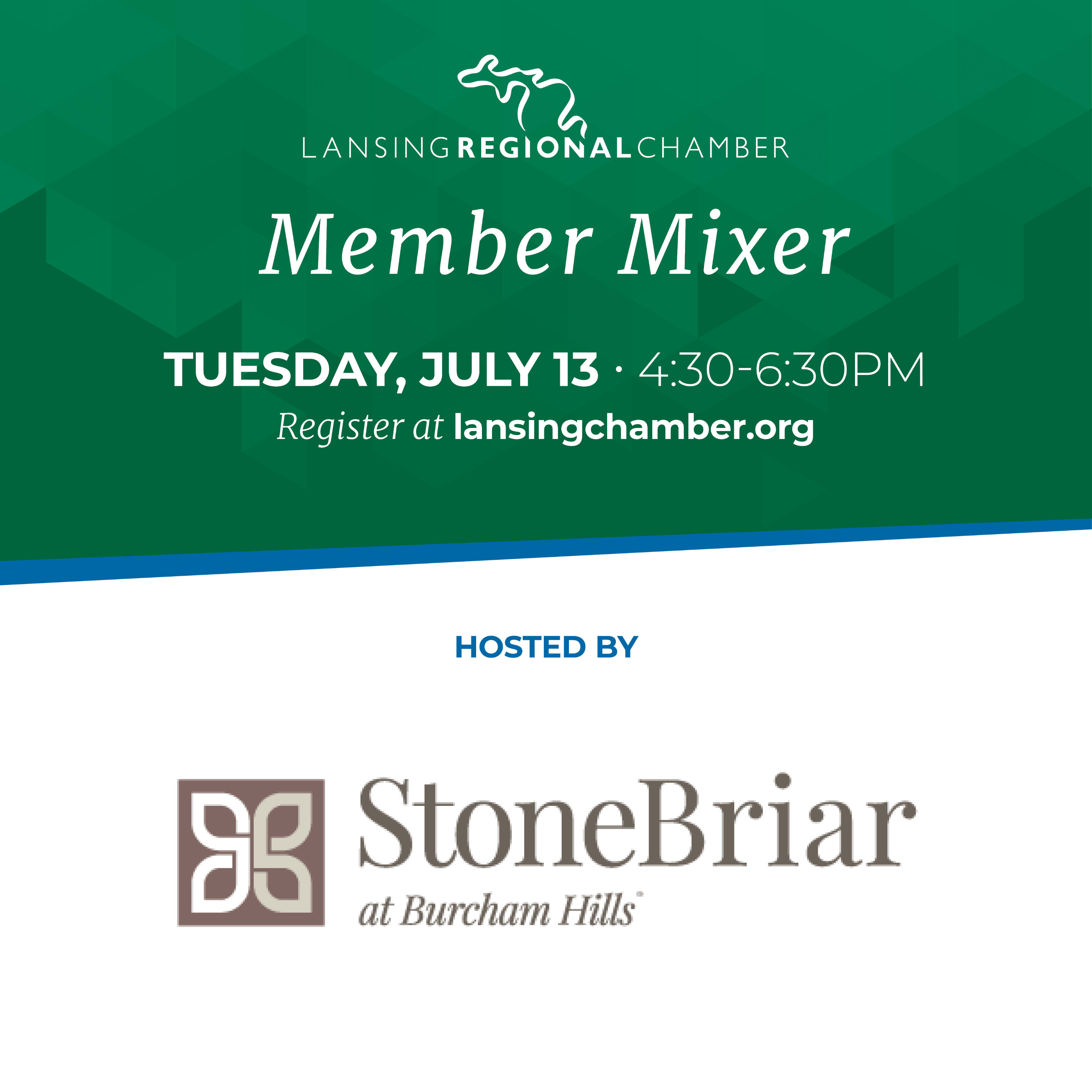 Please join us for our Member Mixer, Tuesday, July 13. Hosted by StoneBriar at Burcham Hills.
