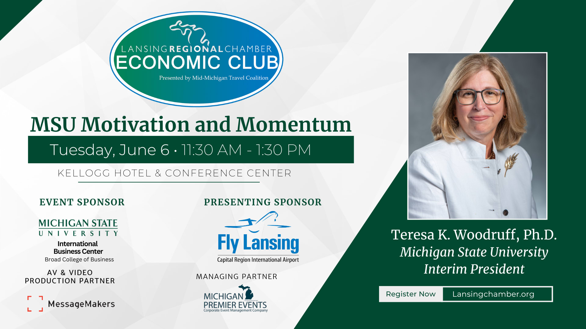 The June Lansing Economic Club will welcome Michigan State University's Interim President, Teresa K. Woodruff, P.h.D, on Tuesday, June 6!