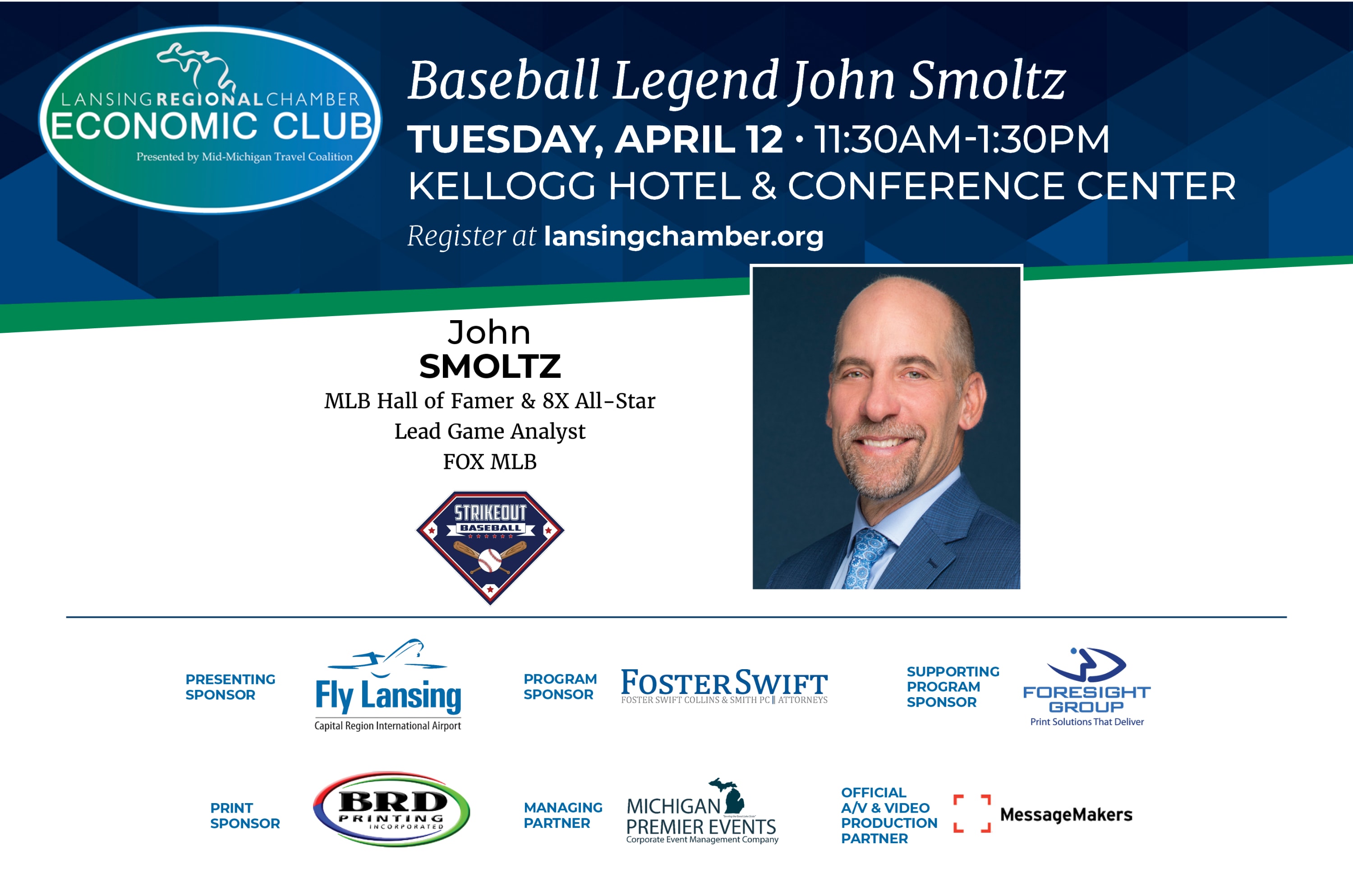 The April Lansing Economic Club will be held on April 12 from 11:30 a.m. to 1:30 p.m. at the Kellogg Hotel & Conference Center in East Lansing. The event will feature John Smoltz, a Waverly High School graduate and former baseball pitcher who played 22 seasons in Major League Baseball from 1988 to 2009. Smoltz will discuss his time in Lansing, career path, and the importance of getting out of your comfort zone and overcoming the fear of failure.