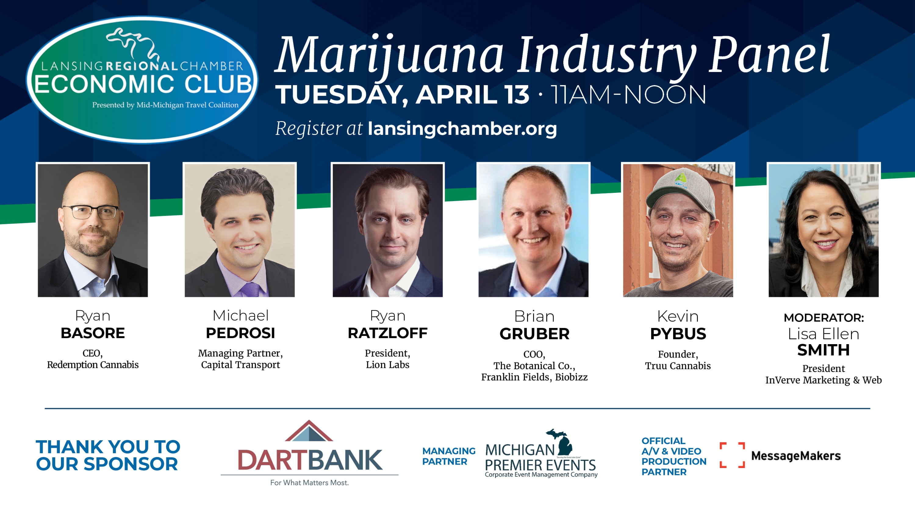 Sponsored by Dart Bank, the April Lansing Economic Club will feature a marijuana industry panel that will discuss this emerging industry, including the new cannabis market in our region, distribution and retail opportunities, creation of a new workforce, transport, and testing. Our panel will include Ryan Basore, CEO, Redemption Cannabis, Michael Pedrosi, managing partner, Capital Transport, Ryan Ratzloff, president, Lion Labs, Brian Gruber, COO, The Botanical Co., Franklin Fields, Biobizz, Kevin Pybus, founder, Truu Cannabis. The panel will be moderated by Lisa Ellen Smith, president, InVerve Marketing and Web.