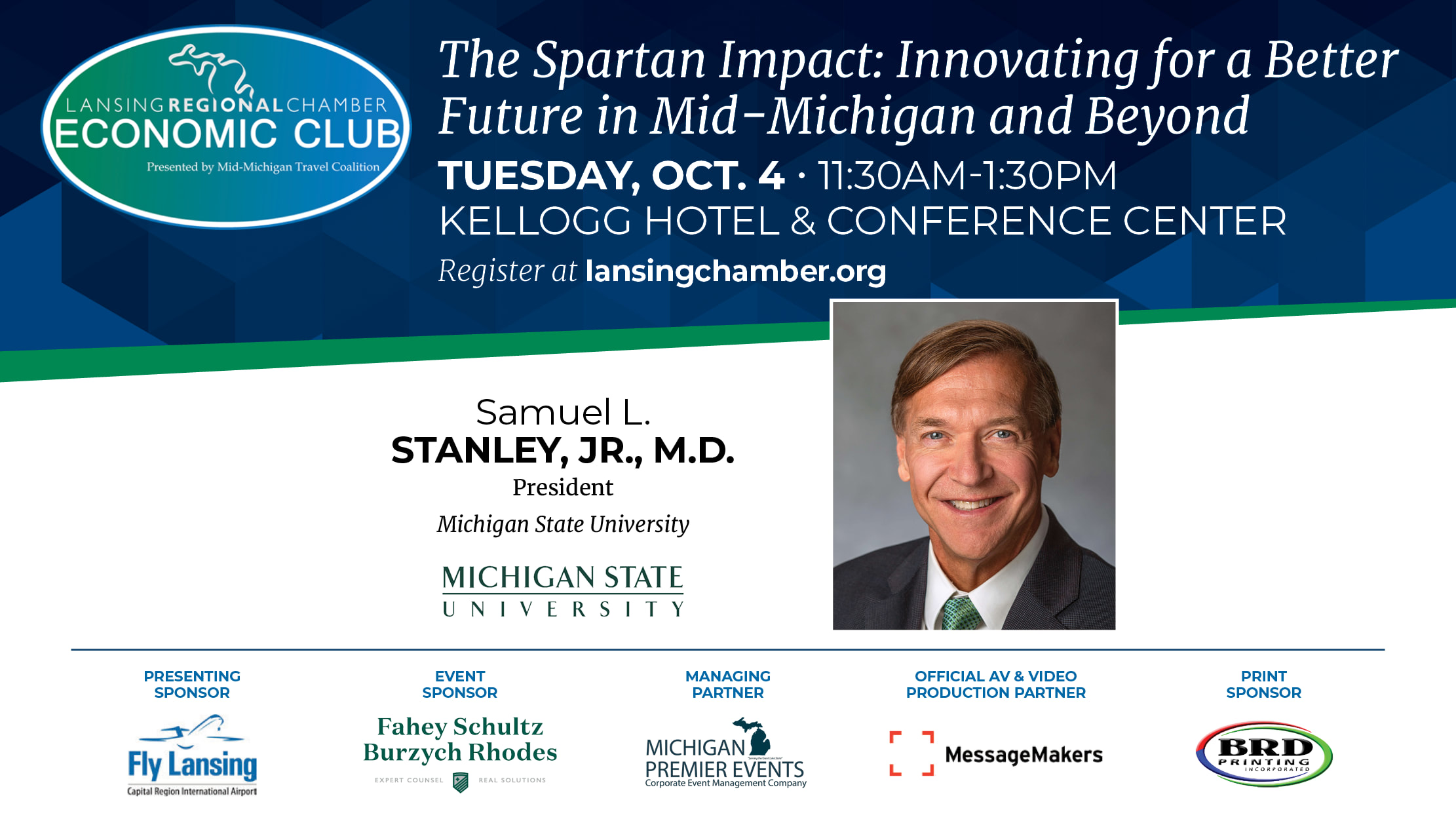The October Lansing Economic Club will be held on Oct. 4 from 11:30 a.m. to 1:30 p.m. at the Kellogg Hotel & Conference Center in East Lansing. The event will feature Michigan State University president, Samuel L. Stanley, Jr., M.D.