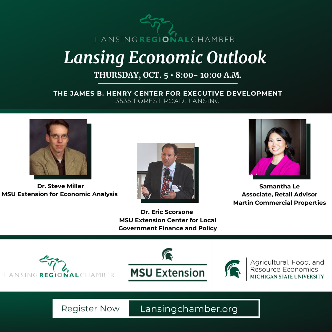 Michigan State University Extension and the Lansing Regional Chamber of Commerce are pleased to announce the first annual Lansing Regional Economic and Fiscal Outlook. The outlook will provide a view of the next year’s economic outlook on income and employment for the region along with the revenue outlook for local governments. Dr. Steve Miller of the MSU Extension for Economic Analysis will present the economic outlook. Dr. Eric Scorsone of the MSU Extension Center for Local Government finance and Policy will present the regional fiscal outlook. Samantha Le, Associate, Retail Advisor, Martin Commercial Properties, will provide an update on the commercial real estate outlook.