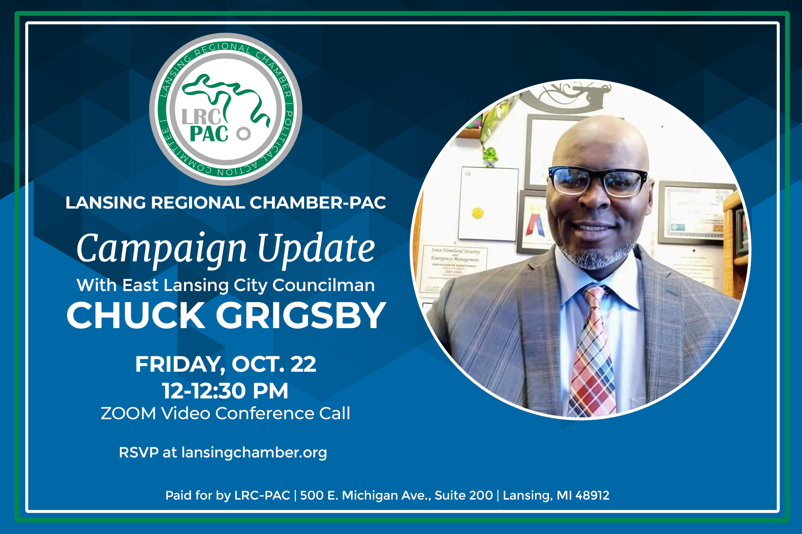 Join us for a virtual campaign update with East Lansing City Councilman Chuck Grigsby on Friday, Oct. 22 from noon to 12:30 p.m. Register to receive your ZOOM link.