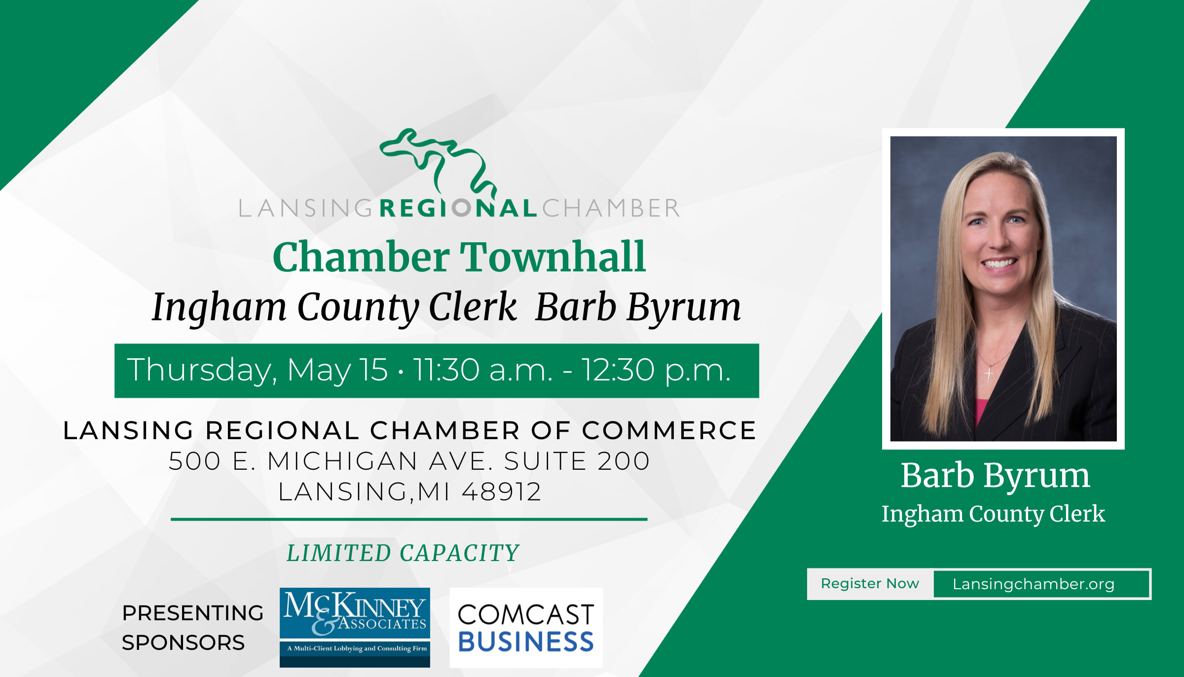 The Lansing Regional Chamber of Commerce Chamber Townhall program series is a unique opportunity for key business leaders and elected officials/candidates to engage on the issues of the day. This roundtable discussion will provide a platform for key chamber members to connect with, discuss, and hear from elected officials/candidates spanning federal to local levels. In recognition of the pivotal role that the Chamber plays in connecting leaders at all levels of government, we are thrilled to host these exclusive roundtable discussions at the Lansing Regional Chamber of Commerce Insurance Capital Board Room. All our Chamber Townhalls are made possible by McKinney & AssociatesImages