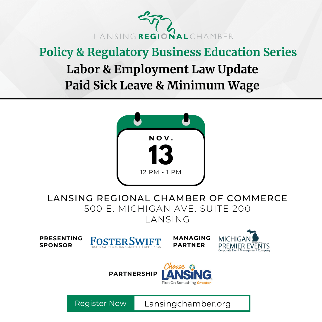 The Lansing Regional Chamber of Commerce Policy and Regulatory Education Series provides members with opportunities to hear from experts on specific policy and regulatory issues that may impact businesses at the federal, state or local level of government. These educational programs are held throughout the year. However, some sessions may be held on an ad hoc basis depending on the timing of a particular issue. Past areas of focus include family and medical leave, overtime rules, paid sick leave, minimum wage laws and medical/recreational marijuana regulations.