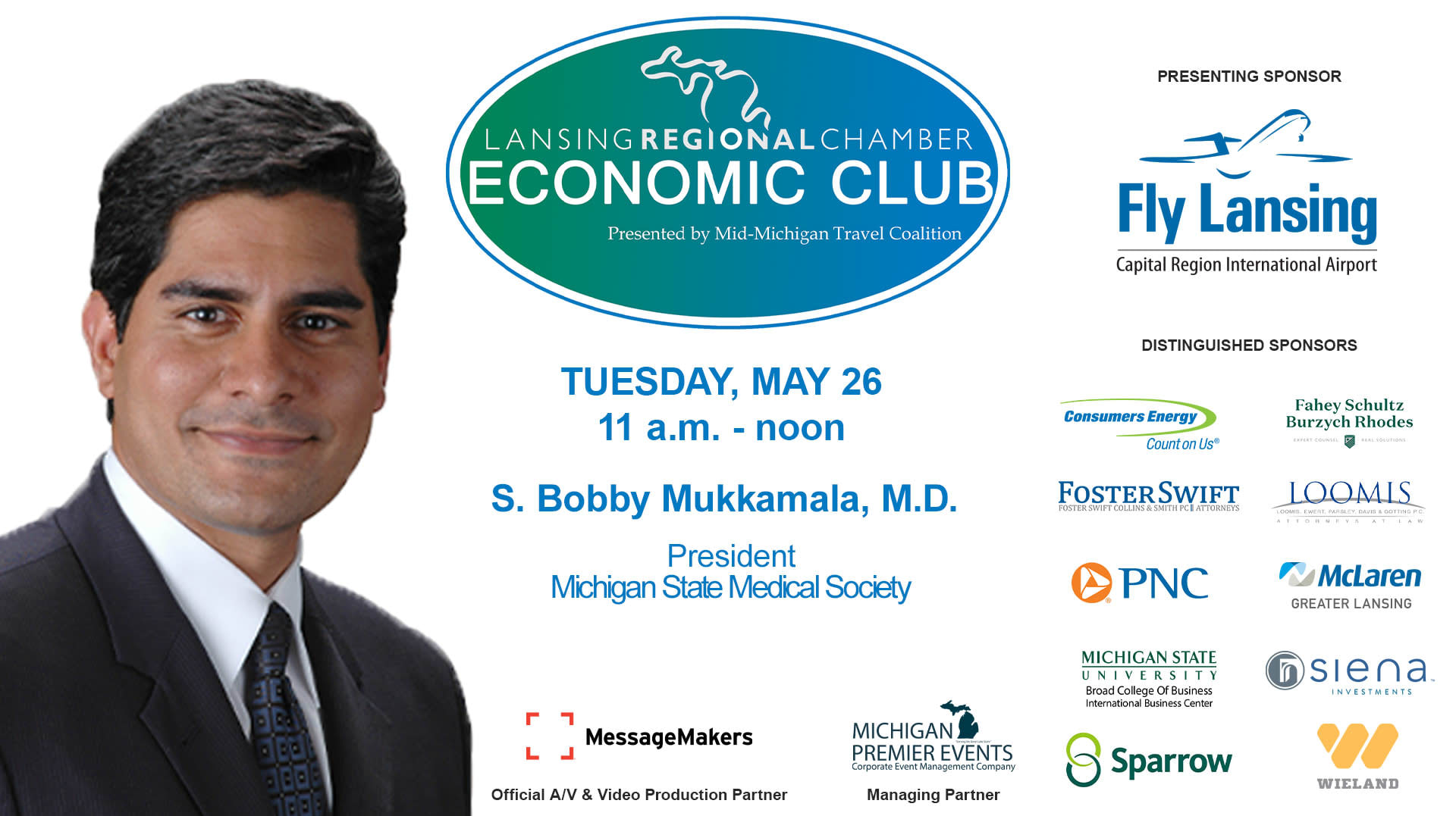 The first virtual Lansing Economic Club program will take place on Tuesday, May 26 from 11 a.m. to noon and feature Dr. S. Bobby Mukkamala, president of Michigan State Medical Society, who will speak on the re-opening of Michigan. Questions can be directed to Ashlee Willis at michiganpremierevents@lansingchamber.org or (517) 242-7434.