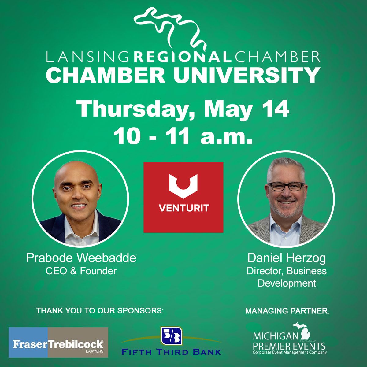 Hosted by Fraser Trebilcock and Fifth Third Bank, the upcoming Chamber University will be held virtually on May 14 from 10 to 11 a.m. The event will feature Prabode Weebadde, CEO and co-founder of Venturit, and Daniel Herzog, director of business development, Venturit, and highlight how artificial intelligence (AI) can be incorporated into your business as well as how AI is changing the way small and mid-sized businesses operate. Contact Ashlee Willis at MichiganPremierEvents@lansingchamber.org with questions.