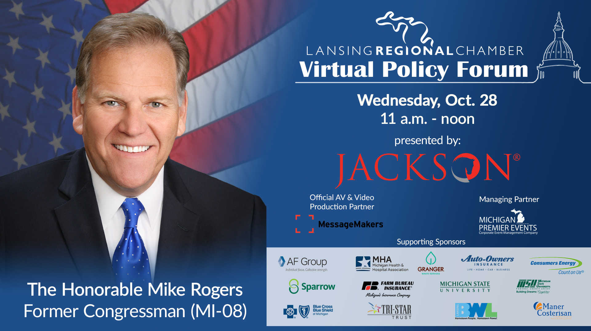 The Lansing Regional Chamber Virtual Policy Forum will feature the Honorable Mike Rogers, former Congressman of Michigan’s 8th congressional district. With less than a week out from the November general election, Congressman Rogers will discuss national and cybersecurity, foreign policy, and the 2020 election.