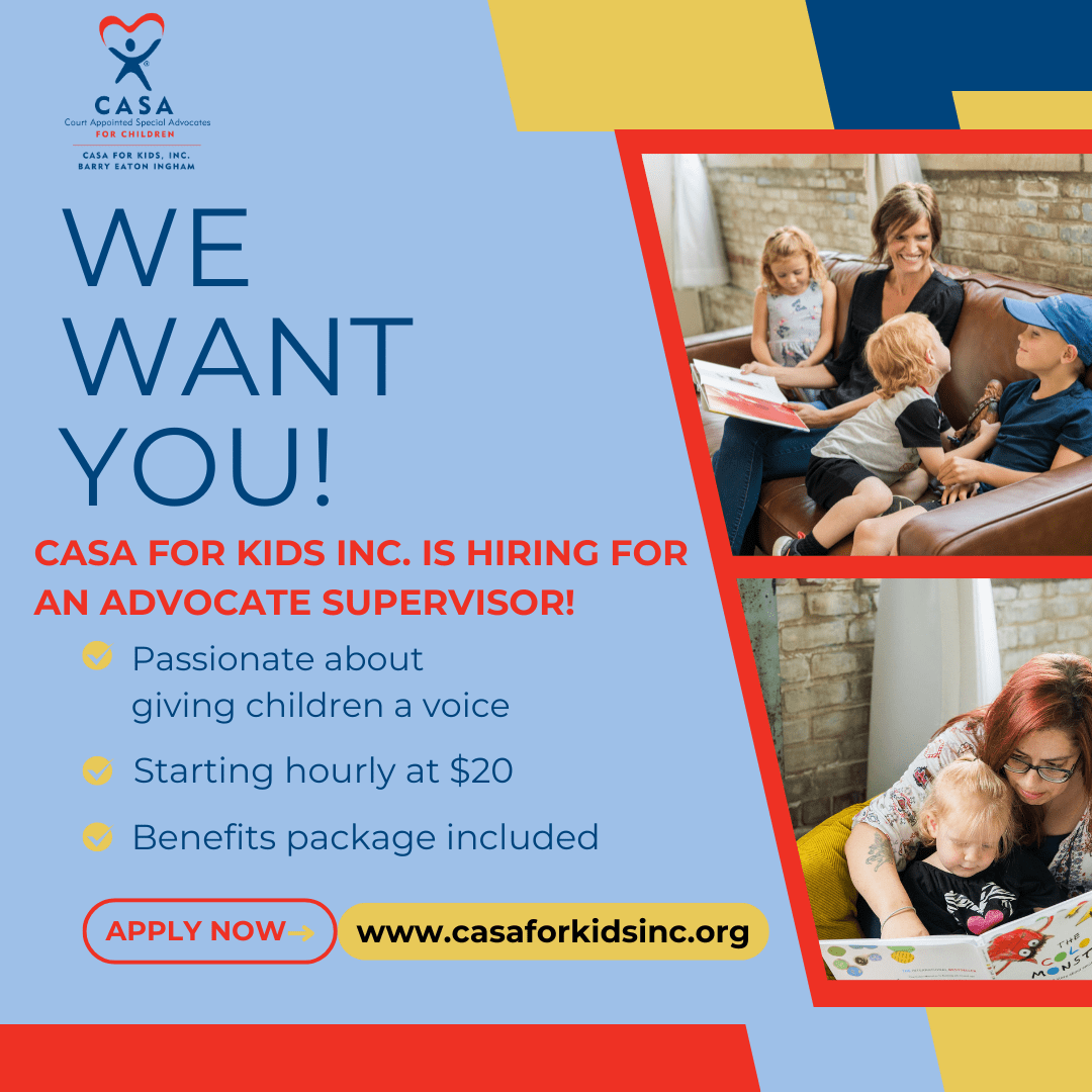 Mail: CASA for Kids, Inc., Attn. Rachel Swedburg, 405 West Greenlawn Ave, Suite 400A Lansing MI 48910